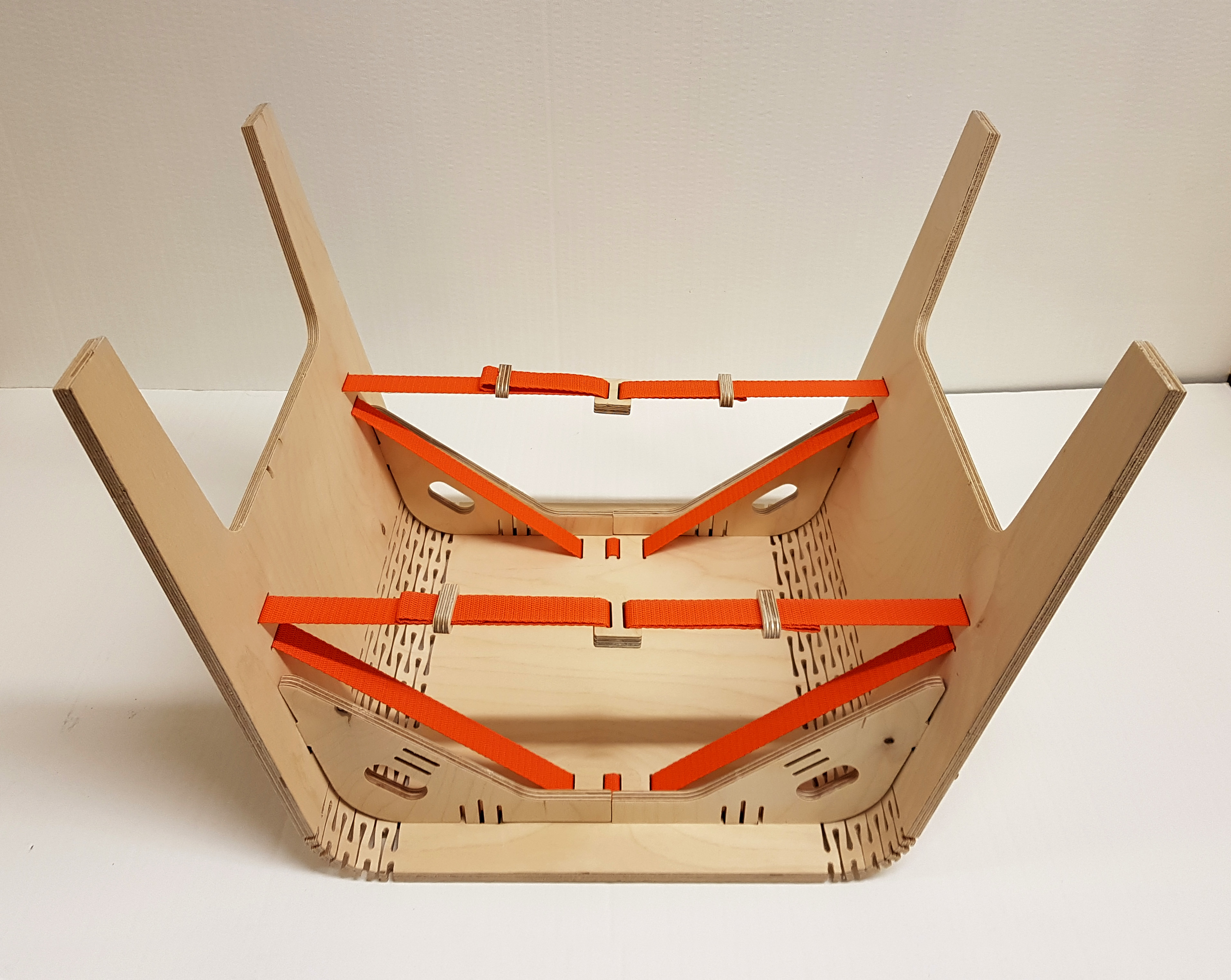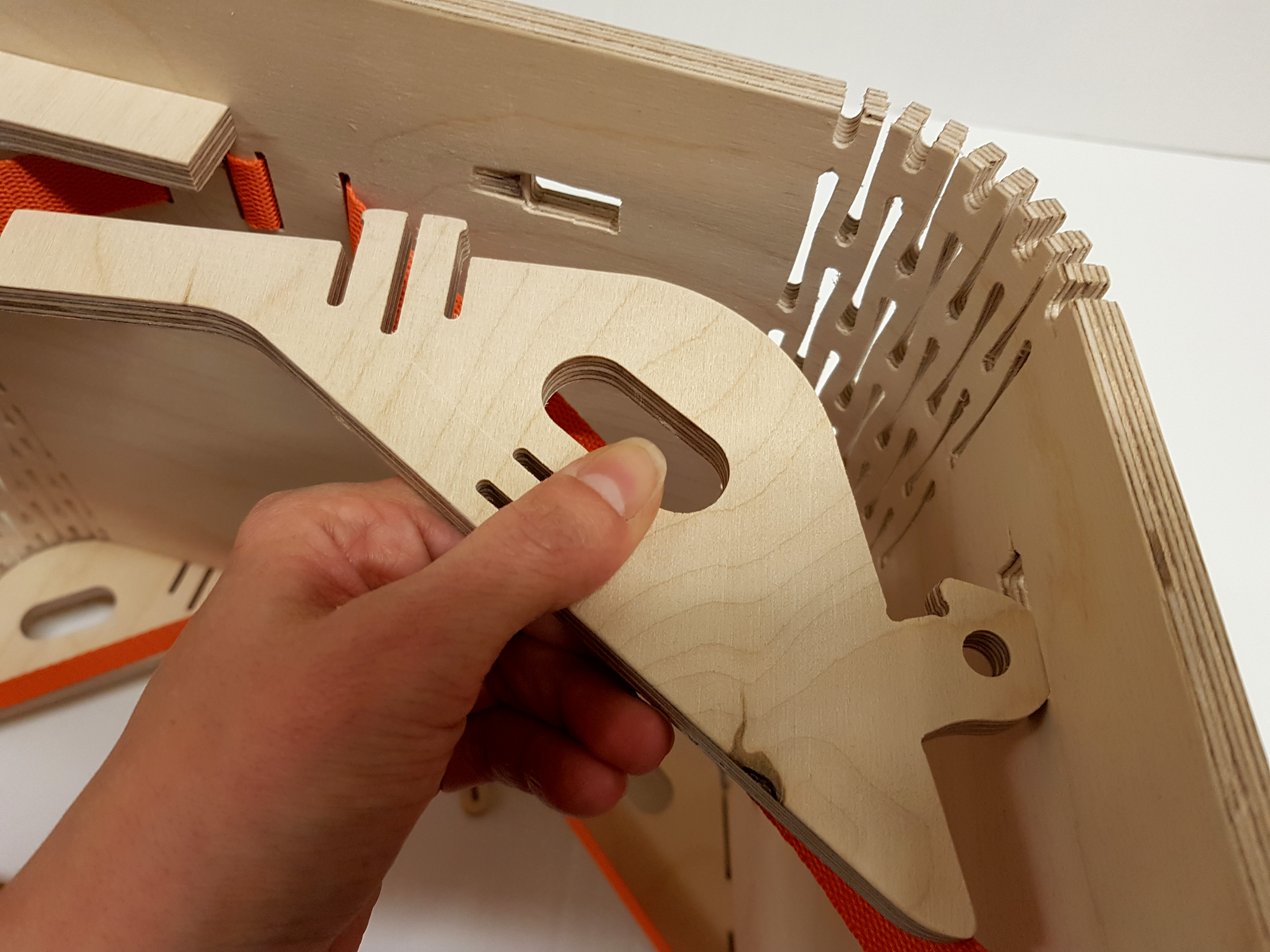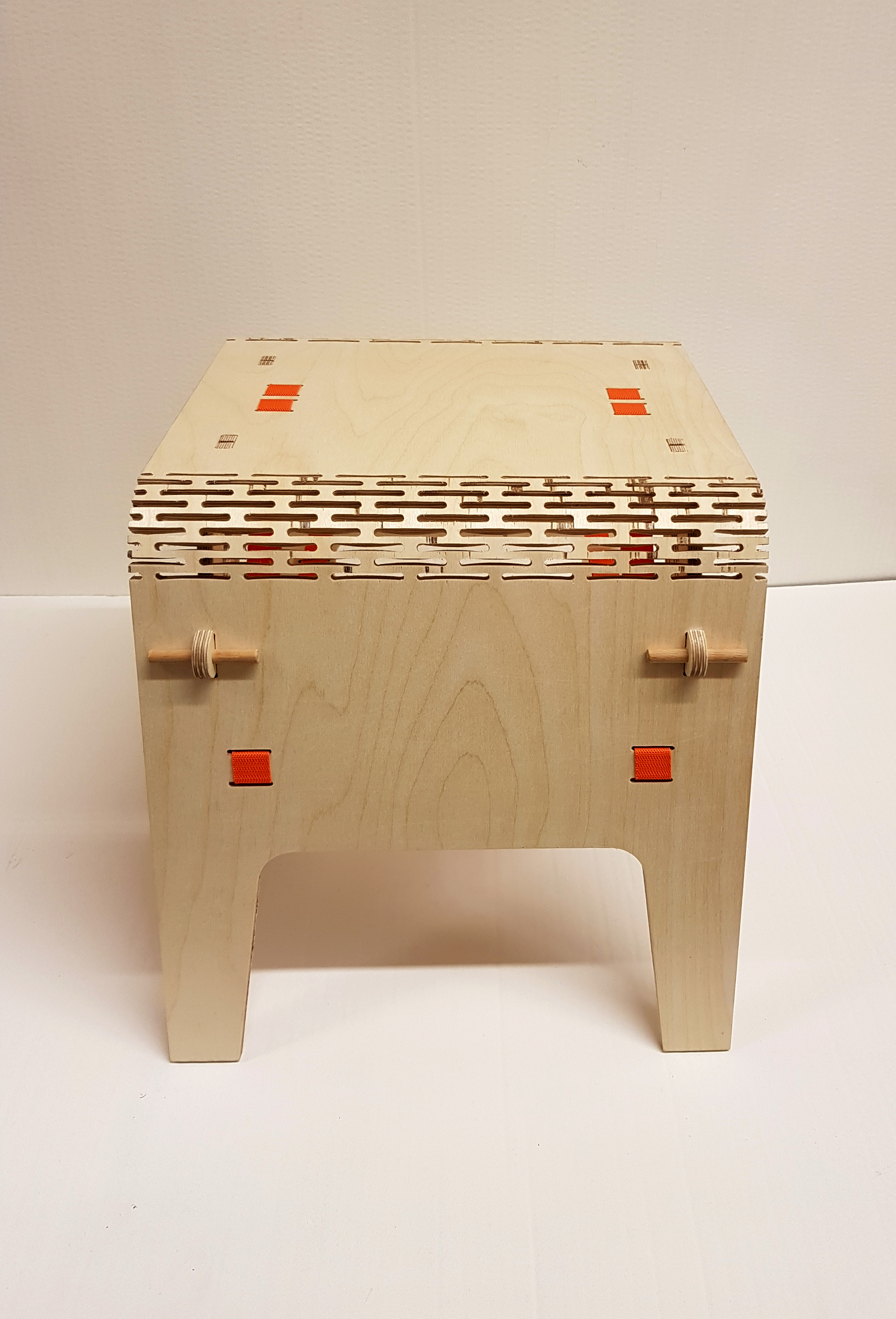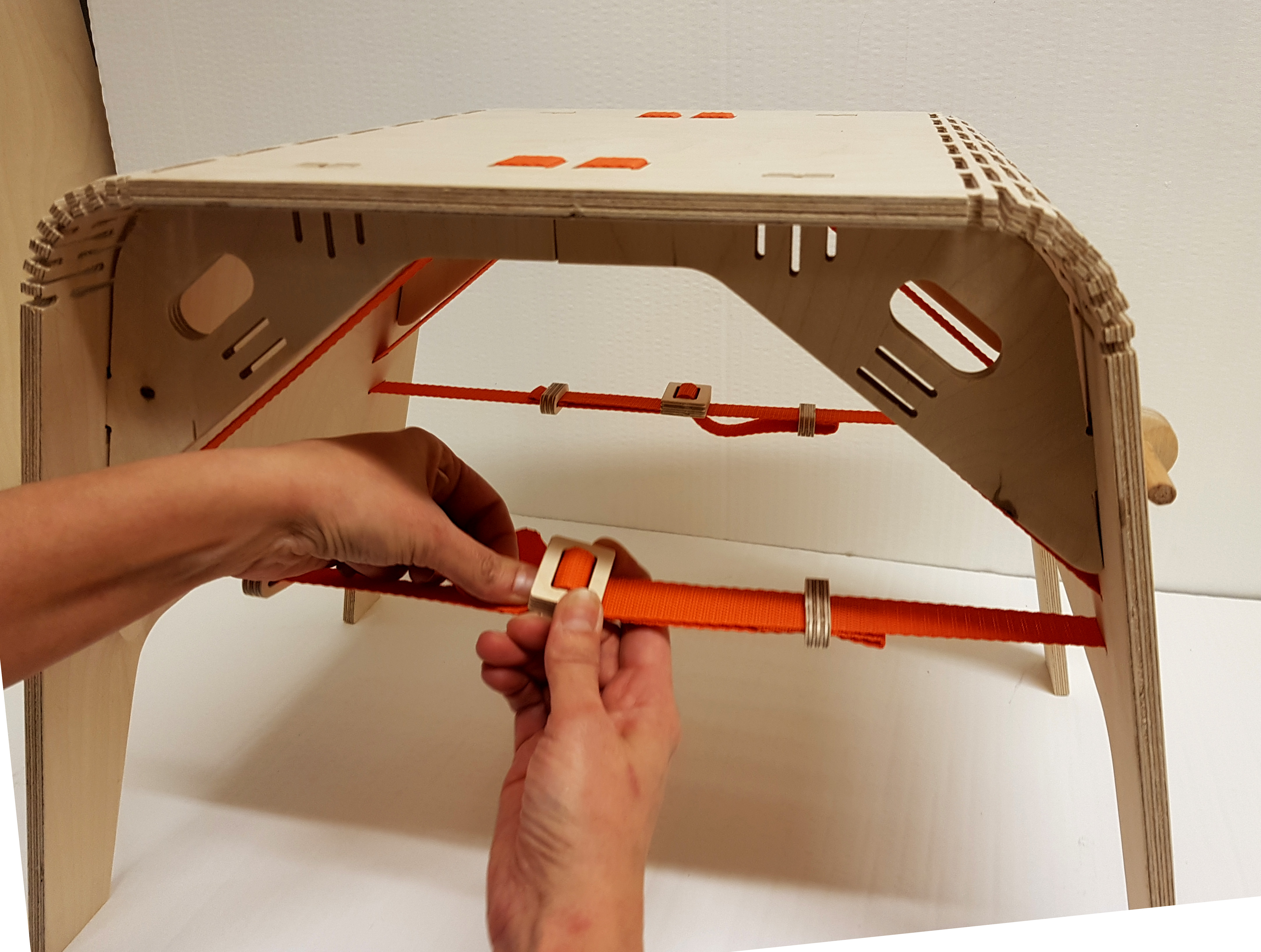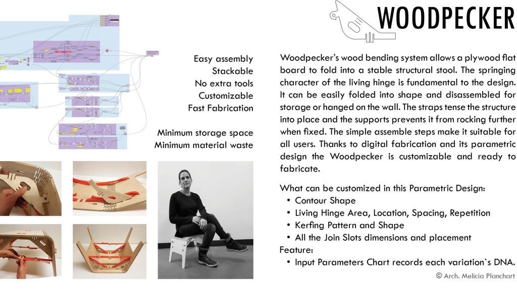 Woodpecker is a wood bending furniture system that allows a flat board of plywood to become a stable structural stool. The springing character of the living hinge is a fundamental part of the design. It can be easily folded into shape and disassembled for storage flat or hanged on the wall. The straps act tensing the structure into place and the supports prevent the hinge from rocking further when fixed. This prototype intended for children with easy and comprehensive assemble steps make it suitable for all users. Fun to use and fun to have. Thanks to digital fabrication and its parametric design the Woodpecker is customizable and ready to fabricate, and to develop into a family of furniture.